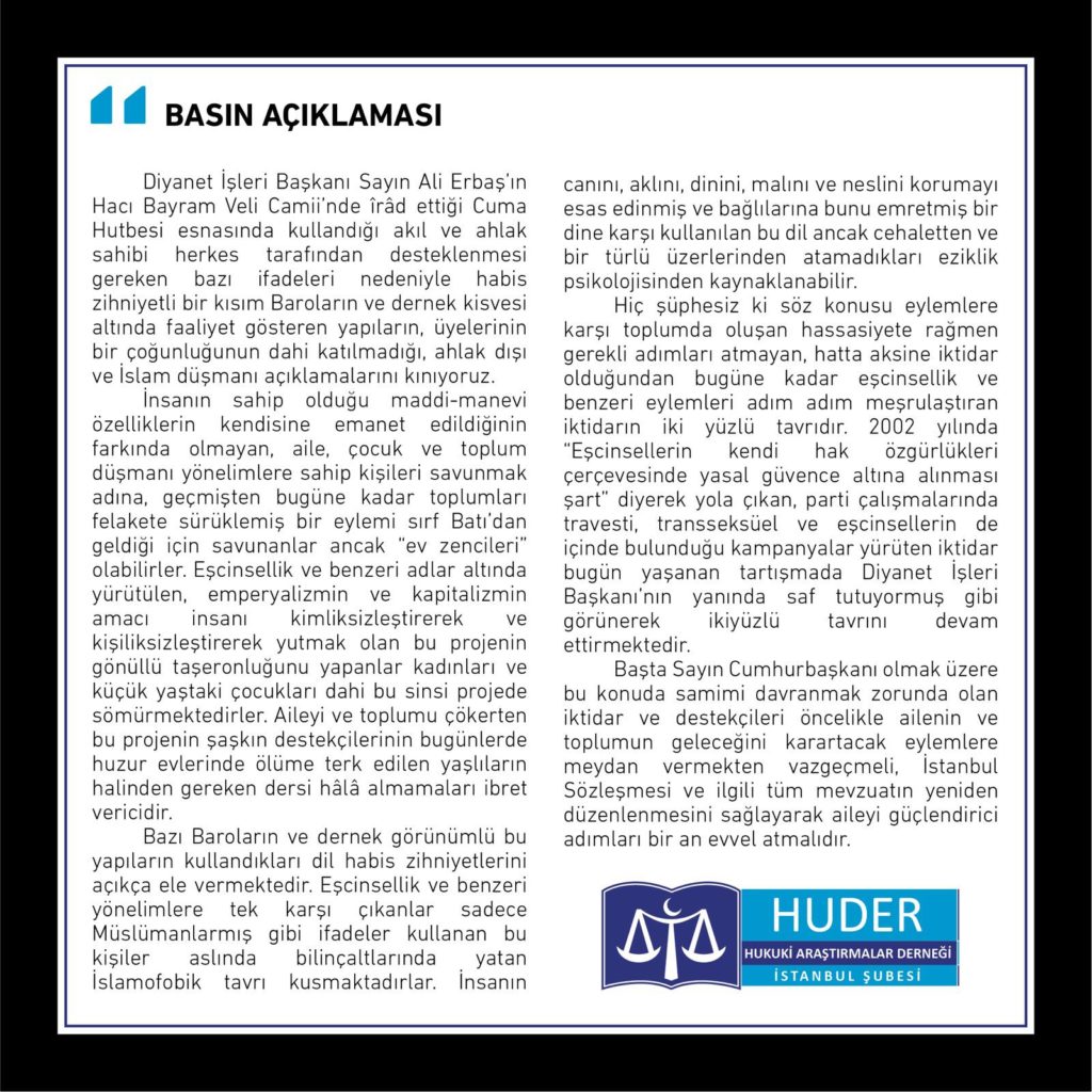 Bir kısım Baroların ve dernek kisvesi altında faaliyet gösteren yapıların üyelerinin bir çoğunluğunun dahi katılmadığı, ahlak dışı ve İslam düşmanı açıklamalarını Hukuki Araştırmalar Derneği (HUDER) İstanbul Şubesi olarak kınıyoruz